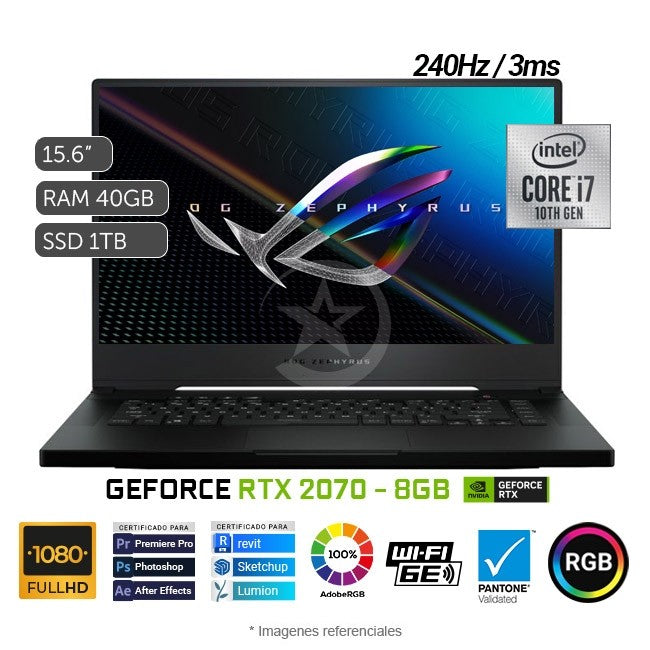 Laptop ASUS ROG Zephyrus M15 (GU502LW) Gaming, Core i7-10750H Hasta 5.0 GHz, RAM 40GB, SSD 1TB, Video 8GB NVIDIA RTX 2070, LED 15.6" Full HD a 240Hz, 100% sRGB, Windows 10 Home