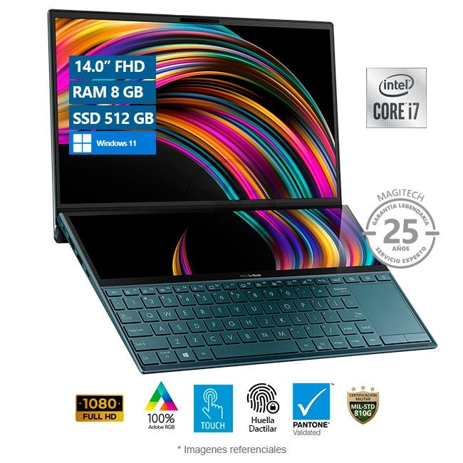 Laptop Asus ZenBook Duo 14 UX481FA, Core i7-10510U Hasta 4.9 GHz, RAM 8GB, SSD 512GB, Dos Pantallas: LED 14" FHD Touch 100% sRGB + ScreePad Plus 12.6", Windows 11 Home