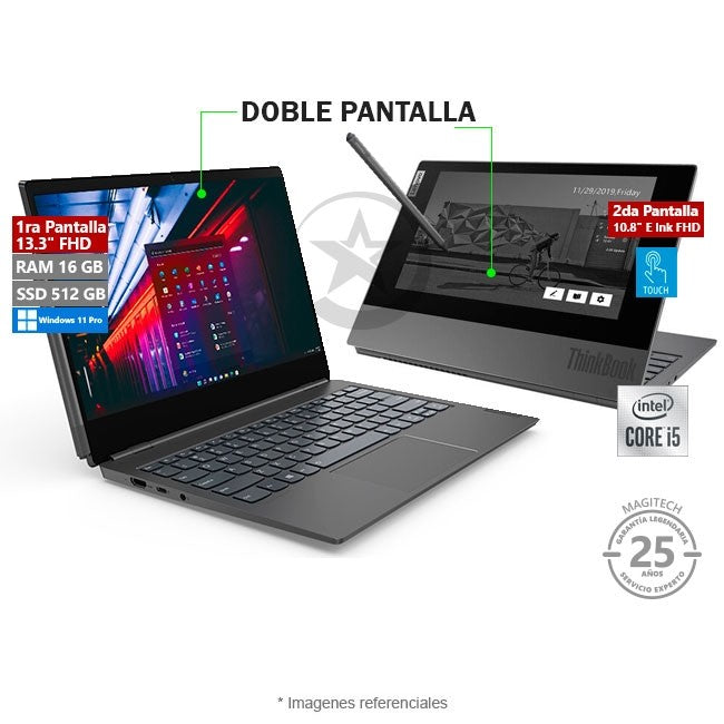 Laptop Lenovo ThinkBook Plus ( 13.3") Doble Pantalla, Core i5-10210U hasta 4.0 GHz, RAM 16GB, SSD 512GB, LED 13.3" Full HD + 2da Pantalla 10.8" E Ink Full HD Touch, Windows 11 Pro SP