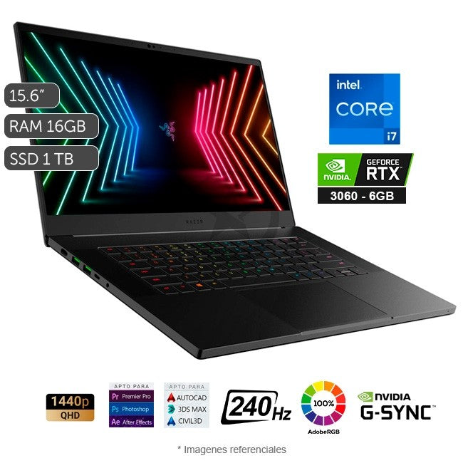 Laptop RAZER Blade 15 Gaming Deluxe, Core i7-11800H Hasta 4.6 GHz, RAM 32GB, SSD 1TB, Video 6GB NVIDIA GeForce RTX 3060, LED 15.6" 2K a 240 Hz, 100% Black Aluminum, Windows 11 Home